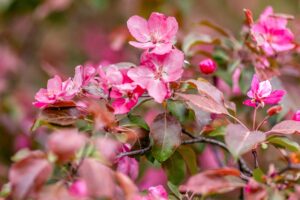 Background of pink apple tree flowers. Blooming spring orchard